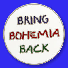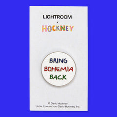 Carry a little piece of David Hockney wherever you go with this Bring Bohemia Back enamel pin badge. Coated metal with a secure rubber backing.